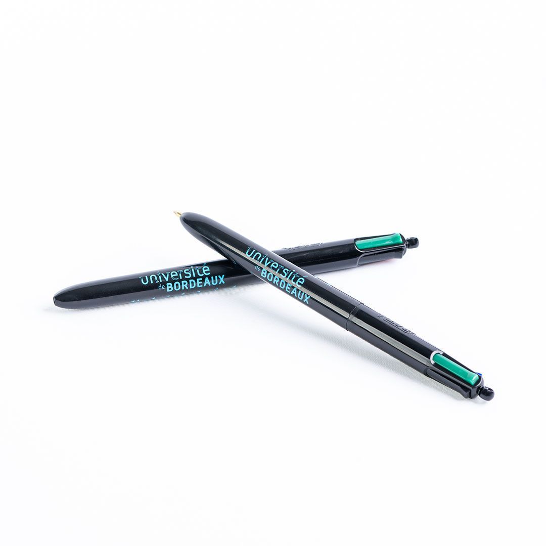 Stylo bille 4 couleurs - Fabriqué en Europe - Plastique noir. Encres : bleue, noire, verte, rouge - PU TTC : 2,10 €