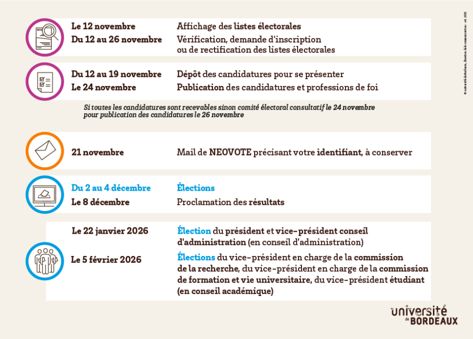 Le scrutin pour renouveler la représentation des personnels et des usagers au Conseil d’administration (CA) et au Conseil académique (Commission de la recherche et Commission de la formation et de la vie universitaire) se tiendra du 2 au 4 décembre prochains par un vote électronique.