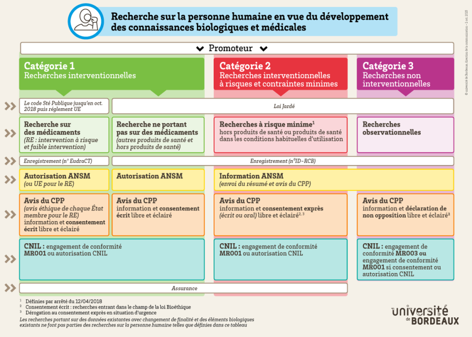 Les projets de recherche impliquant la personne humaine (RIPH) relèvent de la loi du 5 mars 2012, dite Loi Jardé (article L.1121-1 du Code de la Santé Publique).