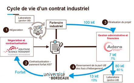 L’université a signé avec l’ADERA (société par action simplifiée filiale de l'université de Bordeaux et de 3 autres établissements d'enseignement supérieur et de recherche) une convention pour organiser leurs relations. Cette convention prévoit que l’université confie à sa filiale ADERA plusieurs missions, dont la gestion des prestations de service et des collaborations de recherche avec le monde socio-économique. Cette Foire aux questions (FAQ) expliquent en détails les modalités de gestion.