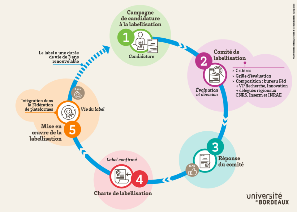 Le processus de labellisation repose sur des critères qui permettent d’apprécier notamment le degré d’ouverture, la qualité de fonctionnement et l’efficience du management de la plateforme candidate. Ce label est décerné par un comité composé de l'université de Bordeaux et de ses partenaires : le CNRS , l'Inserm et l'INRAE.